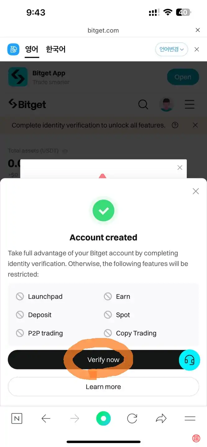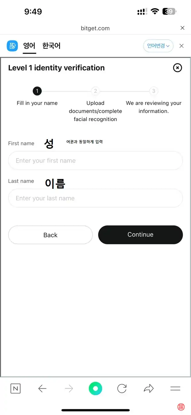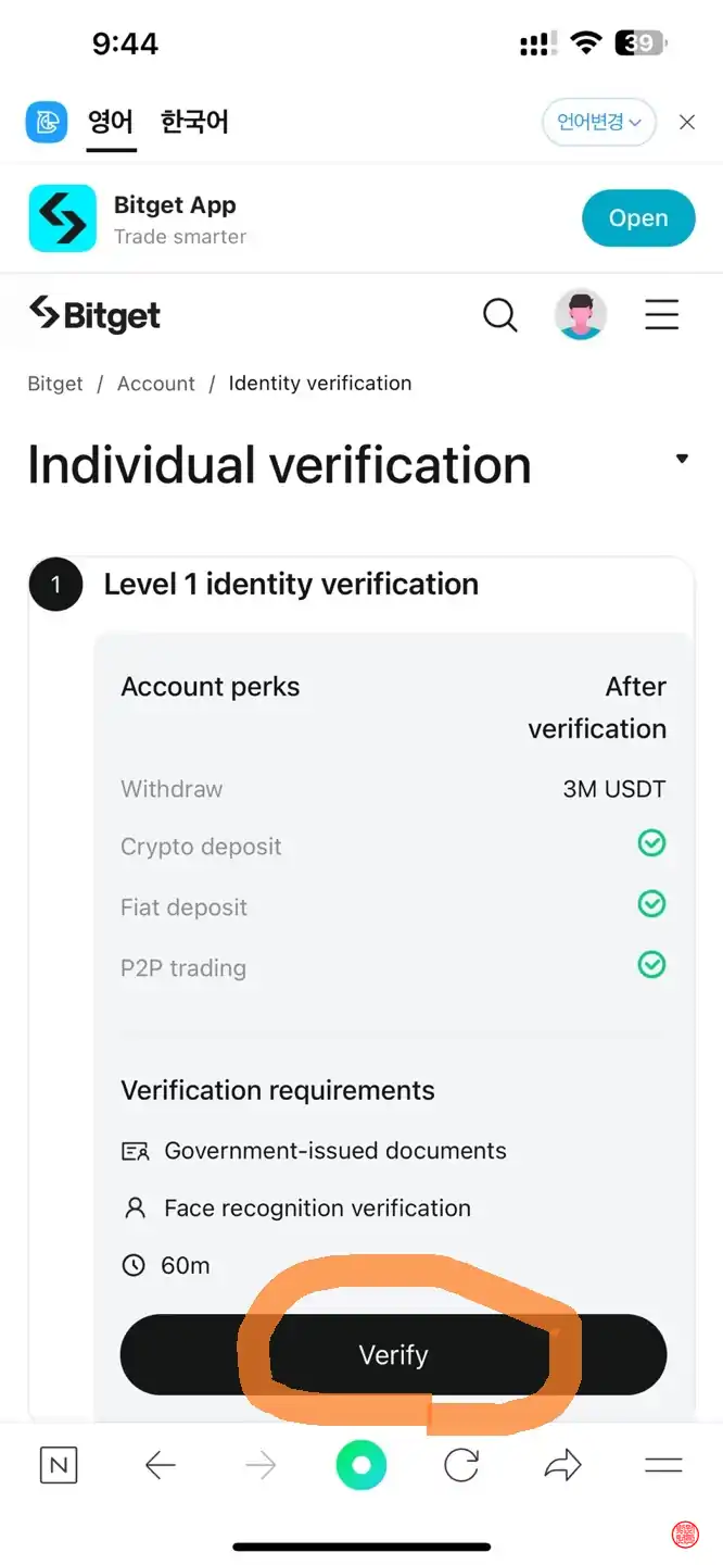 아이디 생성이 완료되었다면 한국의 금융실명제에 따라 신원 확인을 거쳐야 100만원 이상의 자산을
