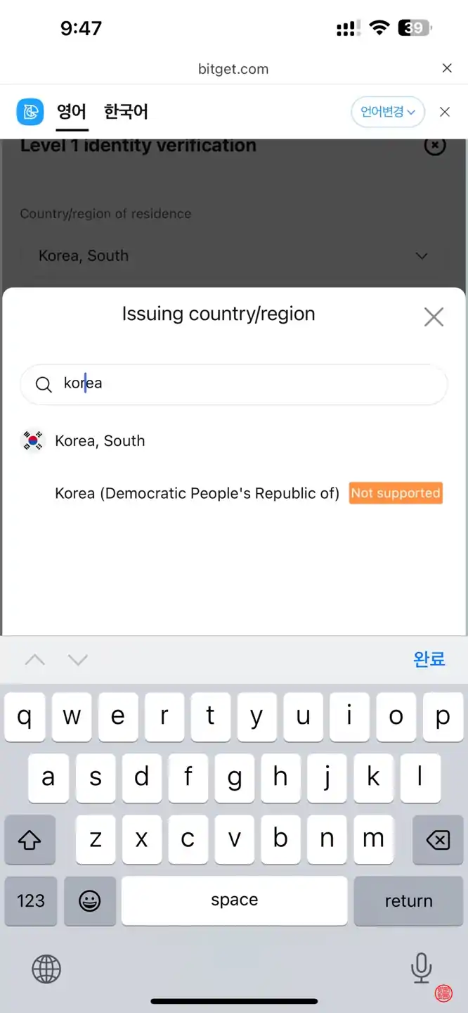 국가를 클릭하고 완료 버튼을 눌러주세요.