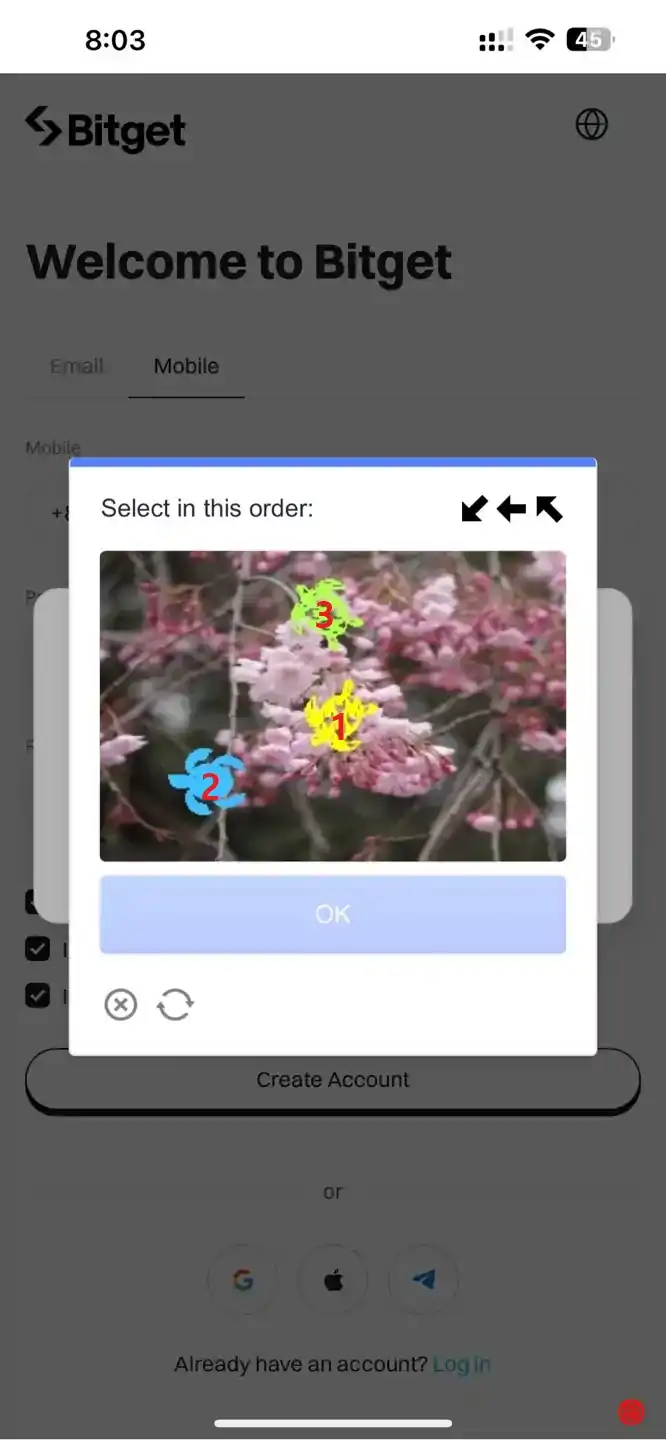 봇 방지를 위해 상단 우측 화살표 힌트와 이미지를 보고 순서대로 터치 또는 클릭합니다.