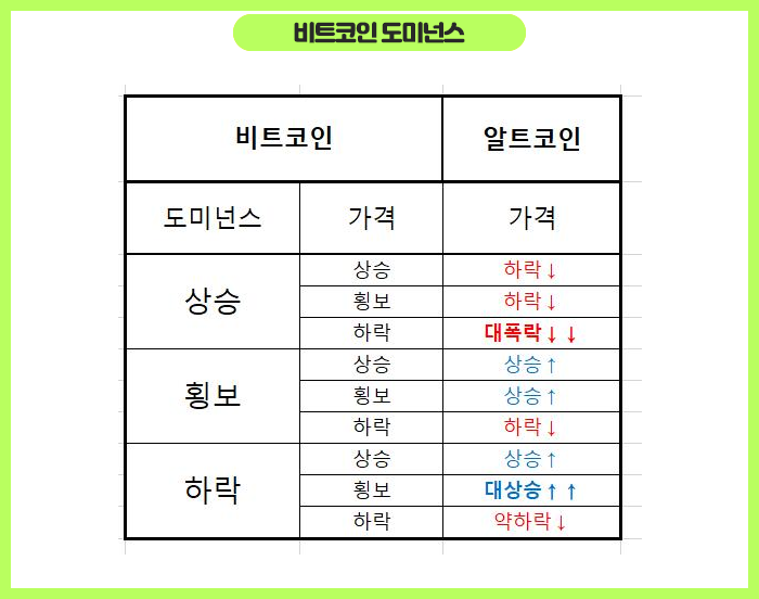 이 표는 비트코인의 가격 상승, 횡보, 하락에 따른 알트코인의 가격 변동을 보여줘요. 이를 통해 투자자들은 시장의 흐름을 더 잘 이해할 수 있죠.