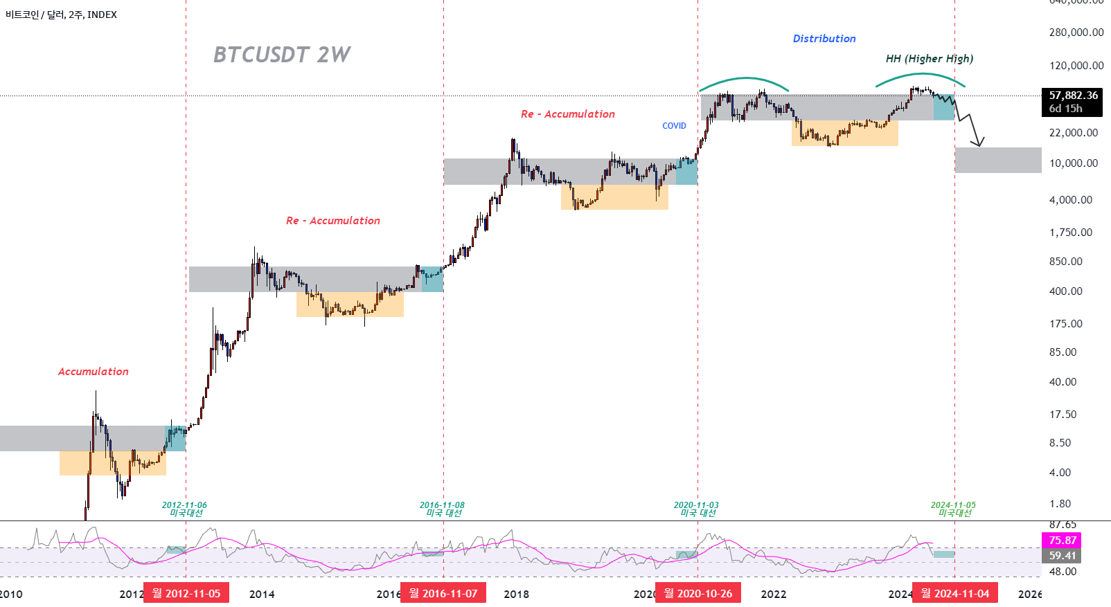 이 차트는 비트코인의 가격 변동을 보여주고 있으며, '축적', '재축적', '분배'와 같은 다양한 시장 행동 단계를 강조하고 있어요. 현재의 하락세는 많은 투자자들에게 불안감을 주고 있죠.