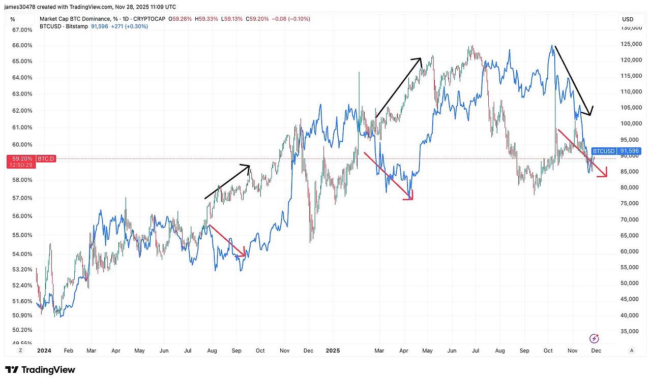 에서 보듯이, 비트코인의 도미넌스가 상승하면서 알트코인의 가격이 어떻게 하락하는지를 보여주고 있어요.