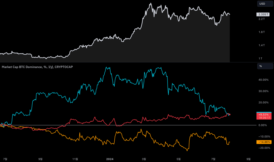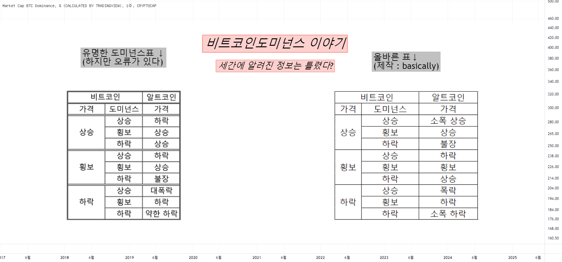 차트는 비트코인 도미넌스를 나타내는 선과 알트코인 가격을 나타내는 선이 포함되어 있어요.